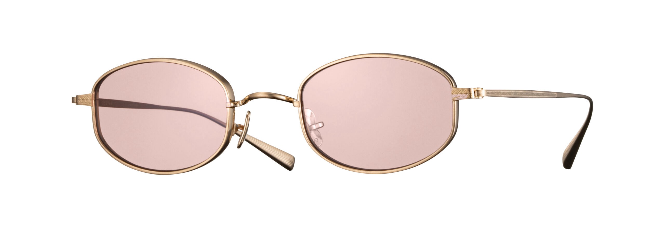 Thompsonのサングラスバージョン(カラーレンズは50%程度のピンク)。クラシカルでありながら今っぽくもあるバレル型(樽型)。直線と曲線で構成されるそのシェイプはスマートさと柔らかさの両方が共存するデザイン。立体的な厚みが特徴のリムが高級感も演出している。ヨロイやテンプルには繊細な模様も刻まれている。