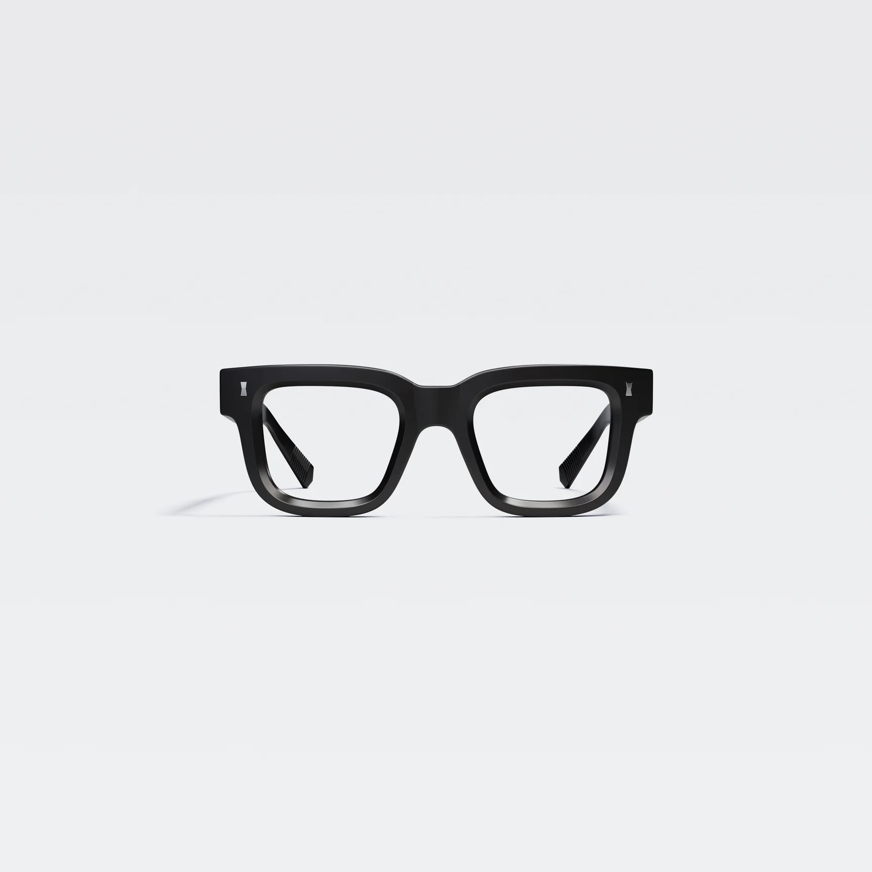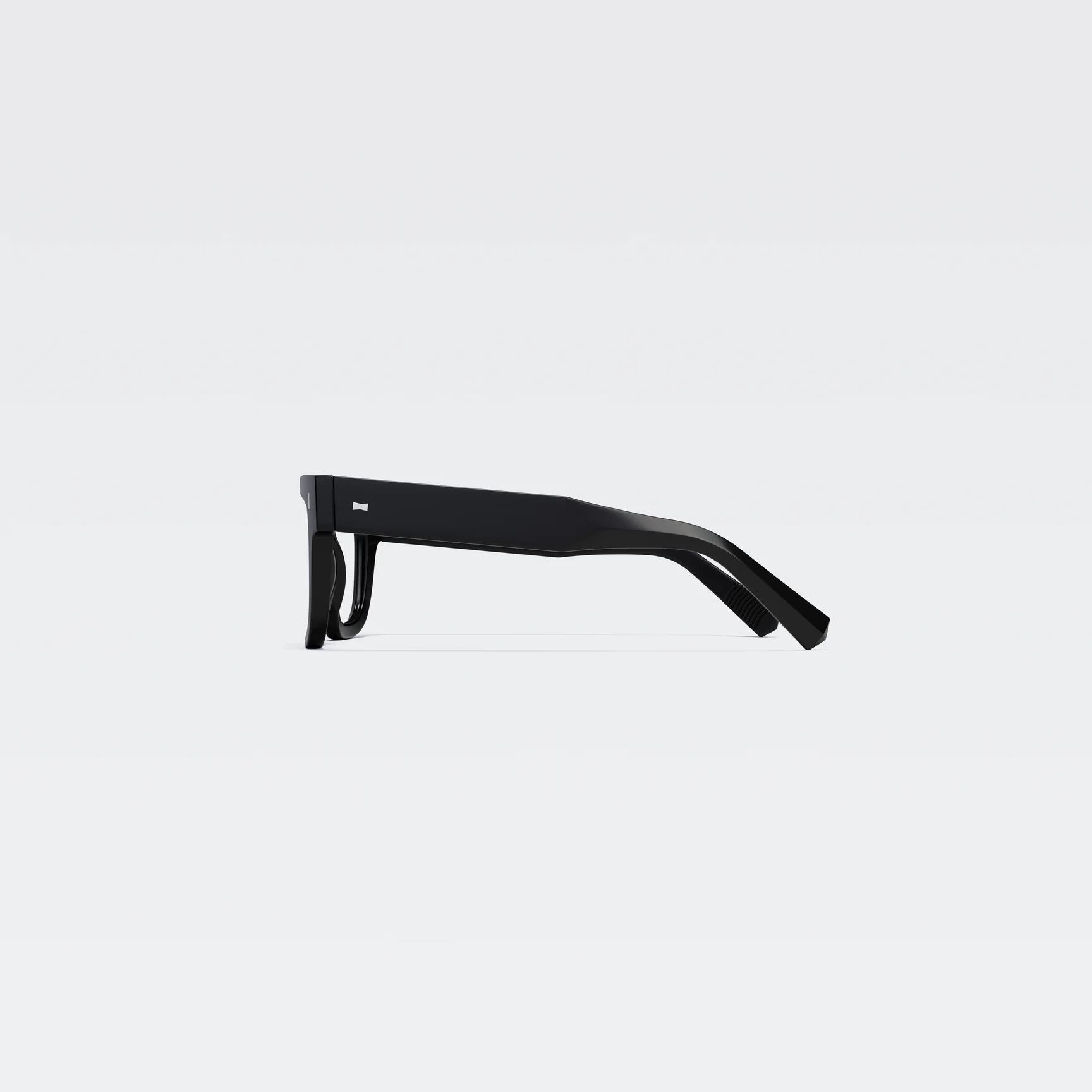 エッジの効いた太めのリムが特徴。力強く直線的なデザイン・厚みのあるテンプルが印象的。テレビジョンカットが施されたリムは奥行きのあるスタイルを演出している。