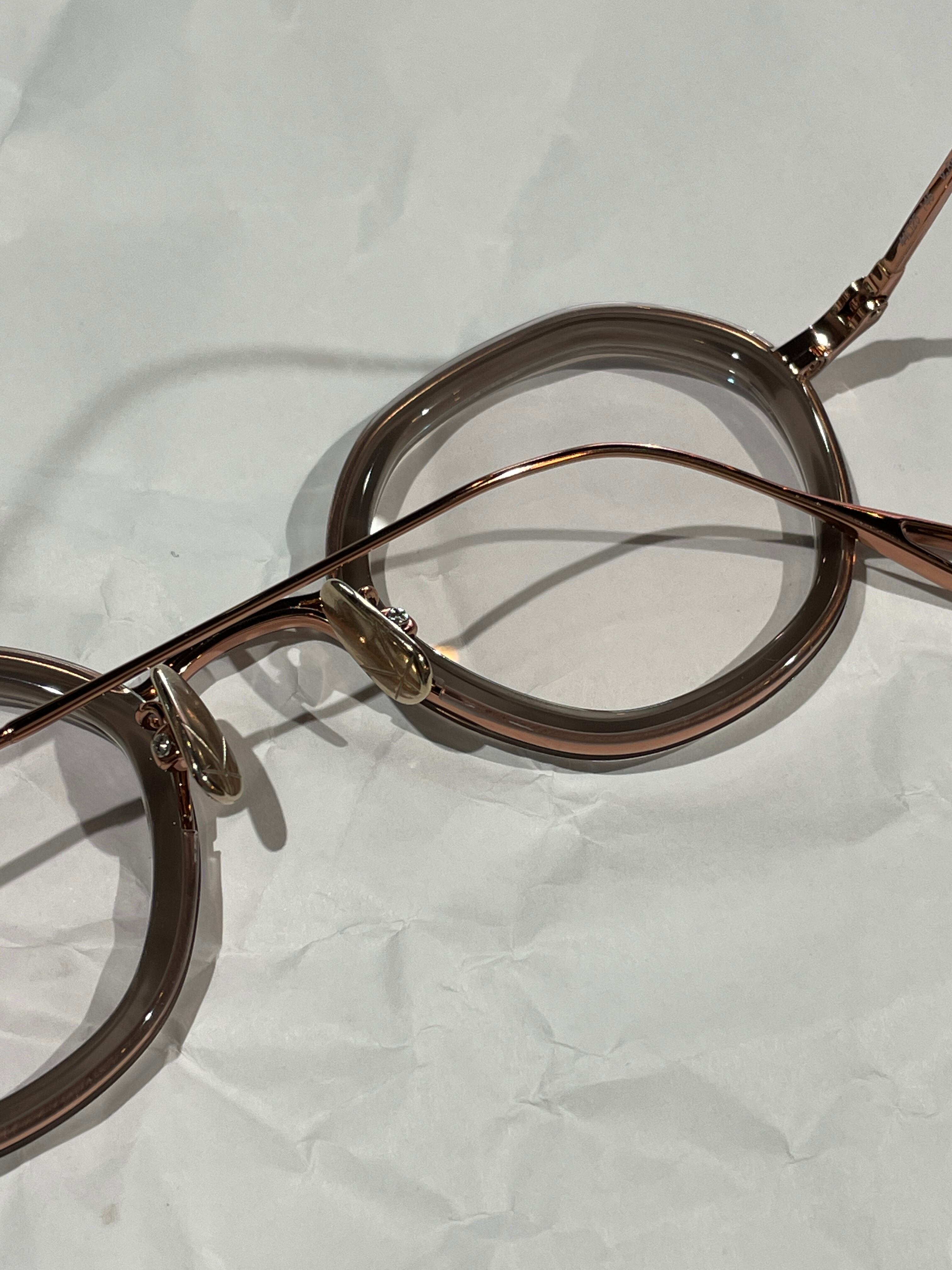 特徴的なブリッジデザインや、小ぶりなフォルムと太めリムの組み合わせのアンバランスさが、奥行きのある味わい深い表情を生み出している。